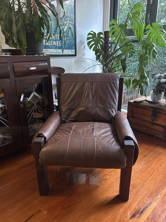Architectural 1970s Solid Timber & Original Leather Armchair